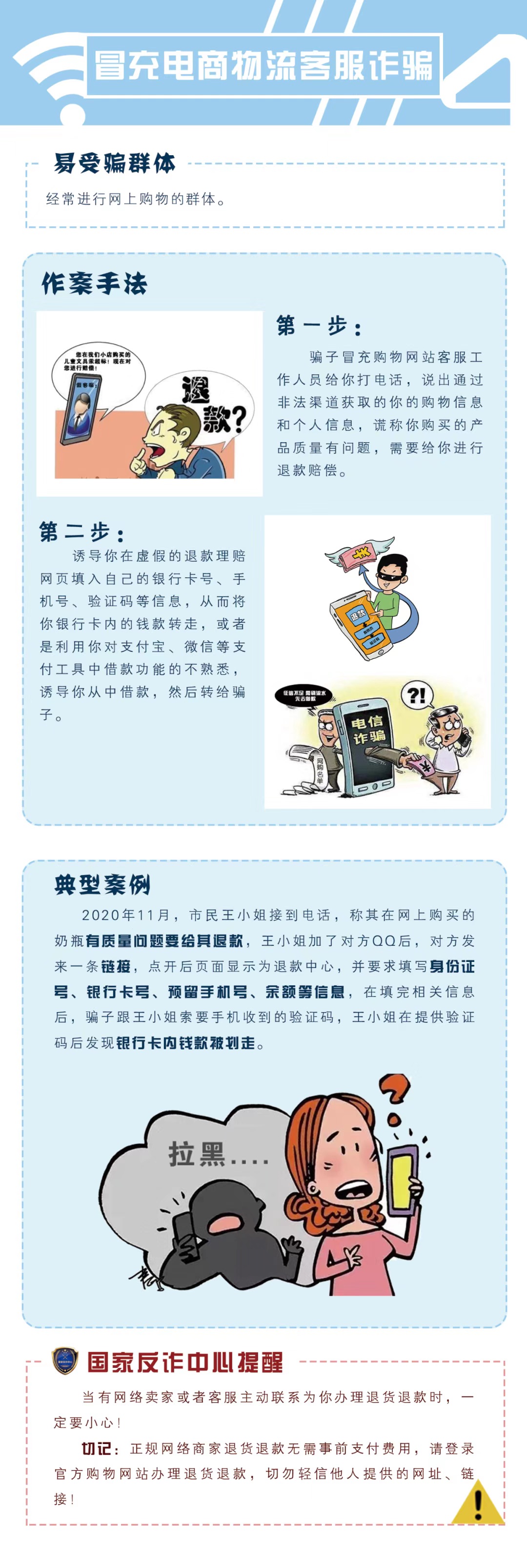 随着社会发展日新月异,各类电信网络诈骗手段层出不穷,诈骗活动防不胜防。为进一步扩大发展宣传覆盖面,本期我们继续介绍两种常见的电信网络诈骗类型,请大家务必认真学习防诈骗知识,提高防骗意识与警惕。