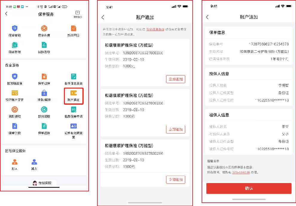 选择要追加的保单,填写追加信息,完成身份证和手持身份证上传,待审核通过即可完成账户追加。