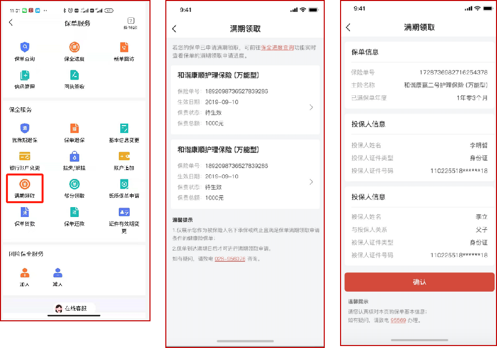 万能型保险产品支持满期领取,APP可展示满足满期领取条件的保单列表,可以在线申请满期领取。点击满期领取保单,上传身份信息后,填写满期领取金额,完成手机号验证,待身份信息审核通过,即可完成满期领取。