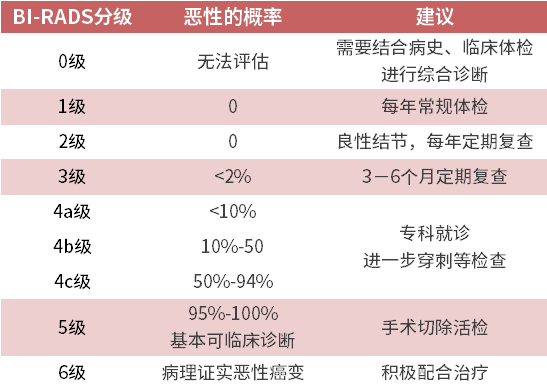 通过 B 超影像的结节分级,可以大致评估结节的危险性,我们以甲状腺结节为例(乳腺结节可参考),它的 BI-RADS 分级为: