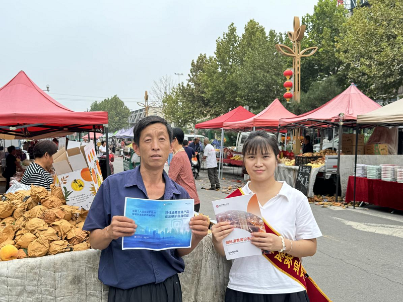 在农村大集上,金融知识讲解员通过向摊主和赶集群众发放保险消费常识手册及“理性消费金融产品、依法维护自身权益”宣传折页等宣传资料,向过往村民普及金融教育知识。