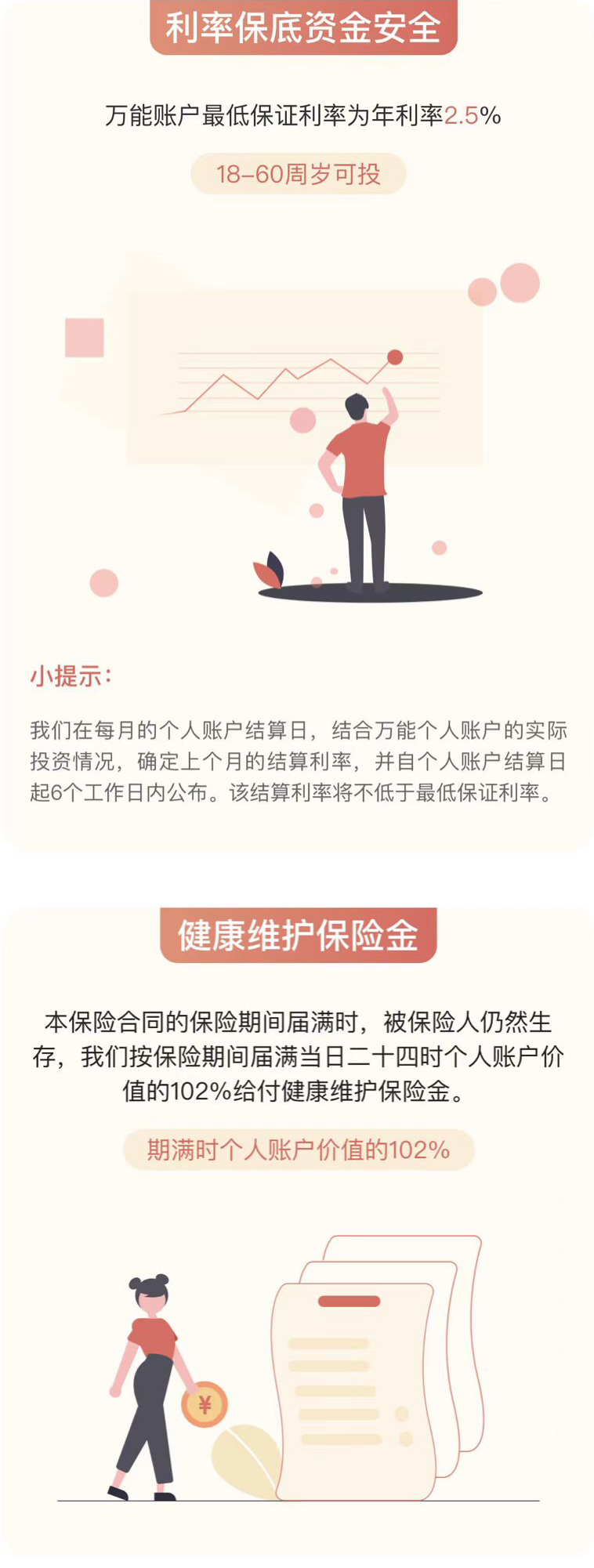 本产品万能账户设有最低保证利率2.5%,每月公布实际结算利率,收益计入上期个人万能账户价值。