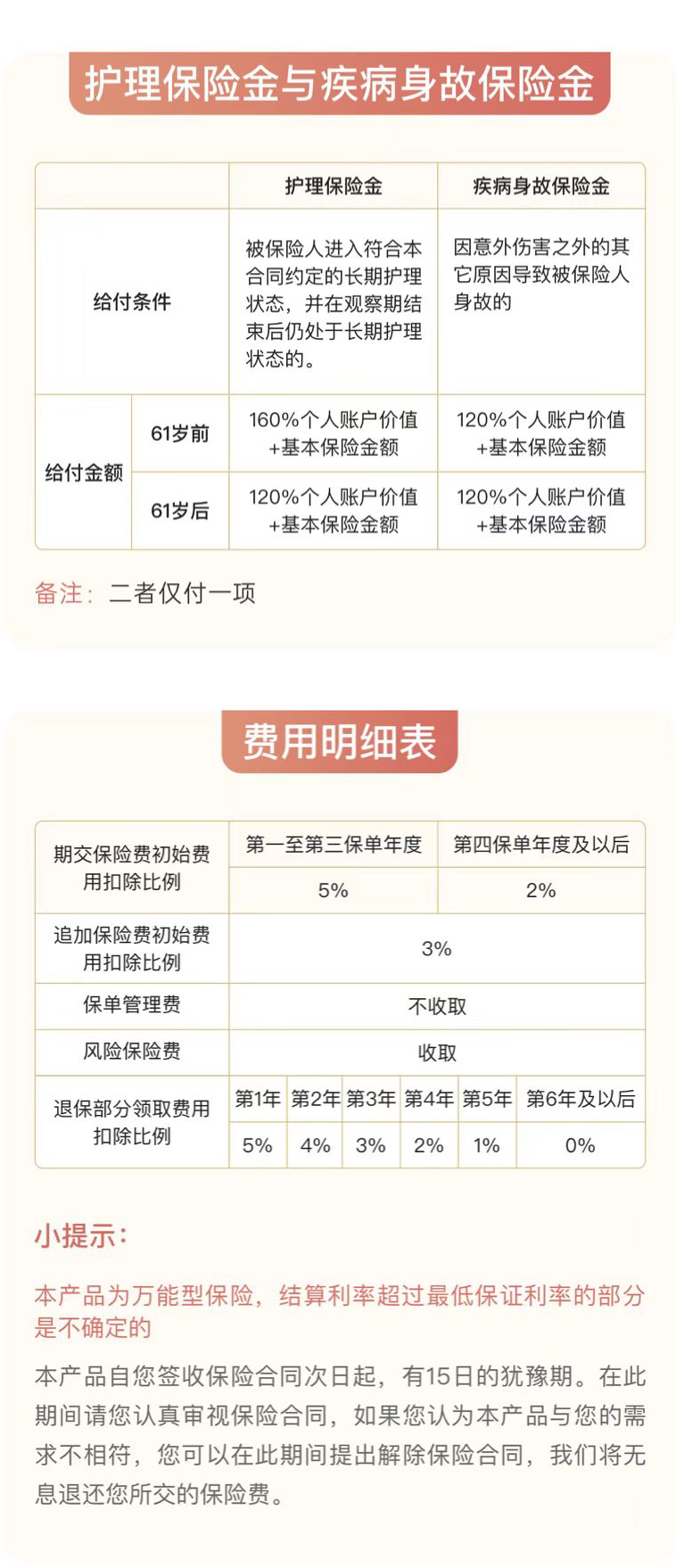 提供护理、疾病身故保险金及健康维护保险金多重保障,突显对生命的关爱。