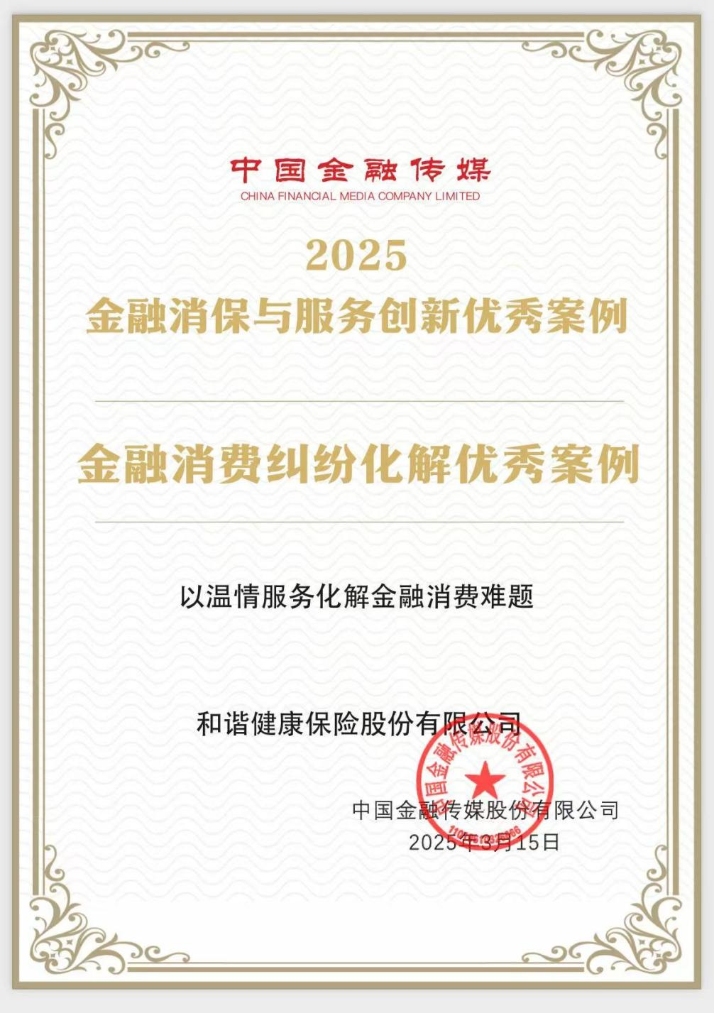 2025年3月15日,由中国金融传媒主办的“保障金融权益 助力美好生活”2025金融消保与服务创新主题活动在北京隆重召开。活动期间,主办方正式公布了“2025金融消保与服务创新优秀案例”入选名单,和谐健康报送的《以温情服务化解金融消费难题》案例脱颖而出,荣获“金融消费纠纷化解优秀案例”奖项。