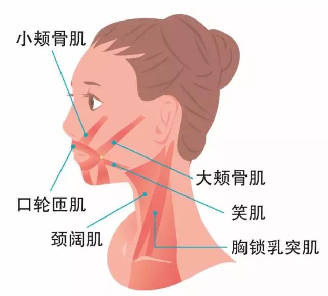 人的面部有20块以上的肌肉,面颊部的肌肉与口部周围的肌肉是相连的,所以面颊部位的松弛是造成嘴角松弛的原因。因此,要通过伸展和锻炼这些肌肉,才能延缓法令纹的产生。